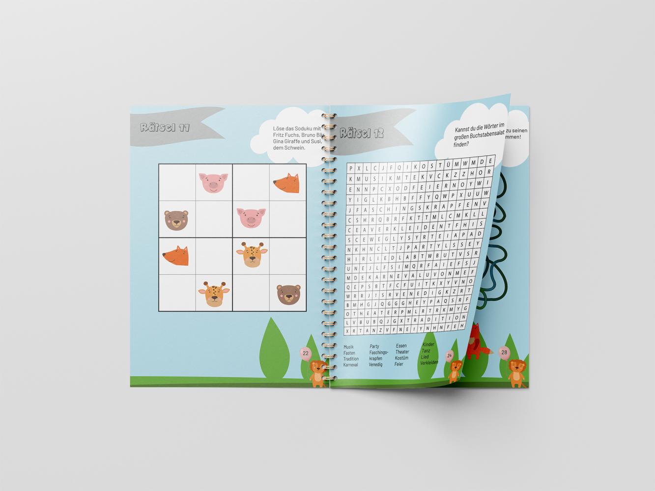 Mithilfe von Sudokus, Suchbilder, Kreuzworträtsel, Ausmalbilder und vielen anderen verschiedenen Rätselformaten werden neun Tierfreunde auf ihrer Reise zum Faschingsumzug in Venedig begleitet.
